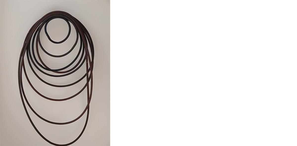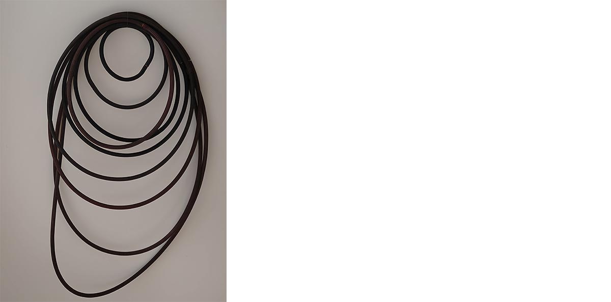 We see a hose rolled up as usual but if you take a closer look each circle closes in on itself, its use has been affected by the scarcity of water. It is forbidden to water. The hose becomes a useless element without water. The downspout annulled the hoses. This hose is worn, blurry, like the river’s colours. To join each part they used some logs that the downspout exposed. The hose surge from the bonds with other people, you ask for them from your neighbours. This work is the first of a series of projects about the water and the territory that I am developing.
